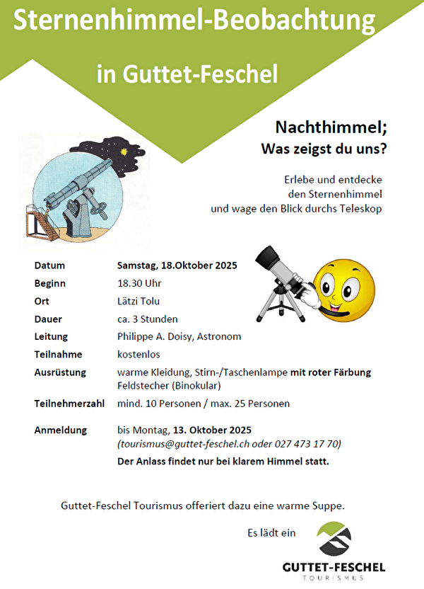 tourismus@guttet-feschel.ch oder Telefon: 027 473 17 70